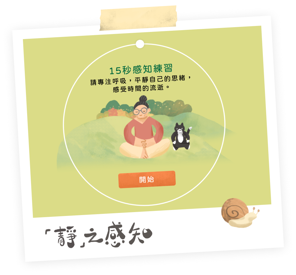 - 先進行15秒感知練習,請專注呼吸,平靜自己的思緒,感受時間的流逝。