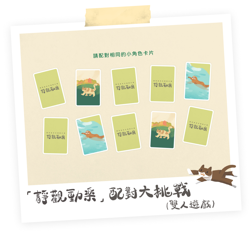 介紹:與朋友一起挑戰記憶力和反應速度,配對相同的「靜觀動樂」小角色卡片,一同享受遊戲的樂趣。